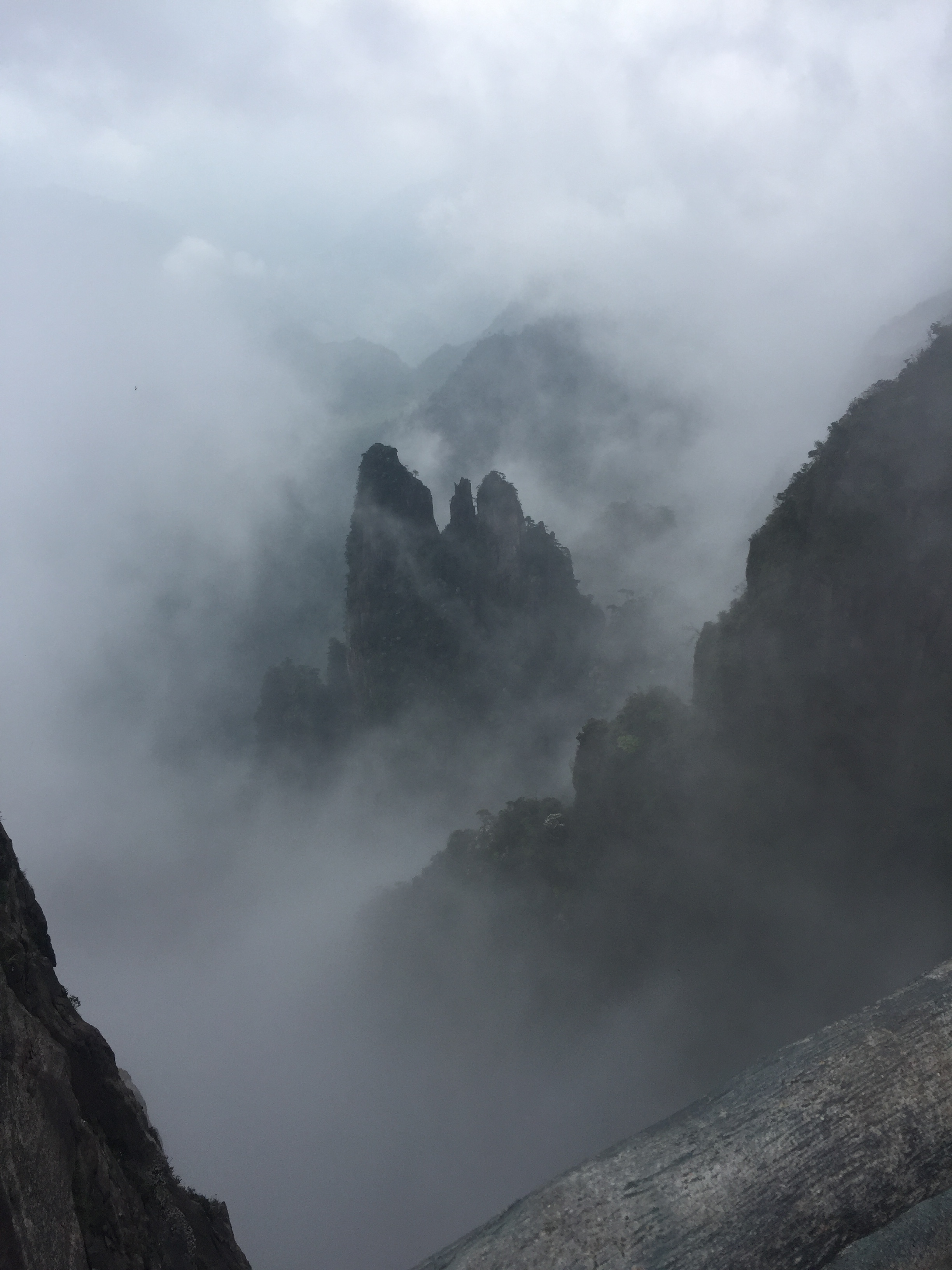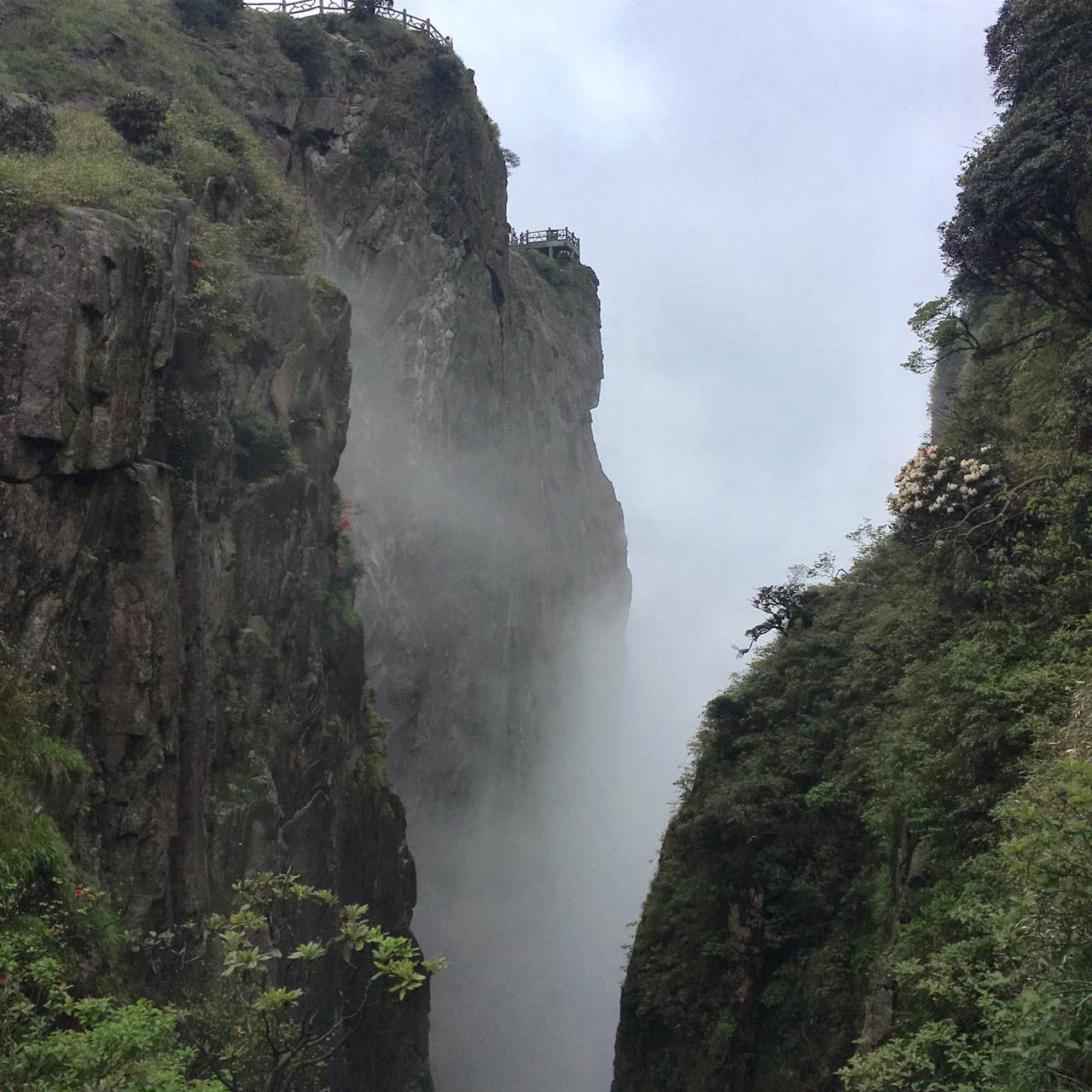 莽山是国家森林公园,天然氧吧,空气清新,以林海莽莽,蟒蛇出没而得名。乘坐景区的大巴,在体验了九曲十八弯的山路后,来到天台山停车场。由于下着毛毛雨,行至半山腰,就看到雾很大,如临仙境。此行最期待的就是“中南第一险”,一路阶梯攀登,终于来到观景台,俯瞰峡谷,危崖万丈,脚下绝壁如刀削过般,云飘雾绕,高深莫测,惊险刺激,果然不虚此行。下山后,大家参观了莽山自然博物馆,见到了著名的烙铁头蛇和其它动植物。