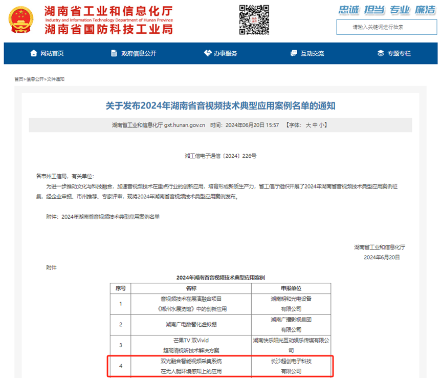 为进一步推动文化与科技融合,加速音视频技术在重点行业的创新应用,培育形成新质生产力,省工信厅组织开展了2024年湖南省音视频技术典型应用案例征集,经公司申报、市州推荐、专家评审,长沙超创电子科技有限公司“双光融合智能视频采集系统在无人艇环境感知上的应用”成功入选。